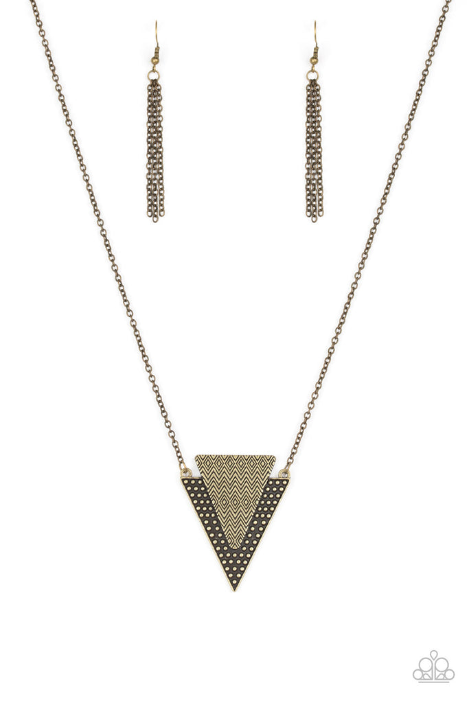 Stamped and studded in indigenous inspired textures, a stacked triangular pendant swings from the bottom of an elongated brass chain for a trendy tribal look. Features an adjustable clasp closure.