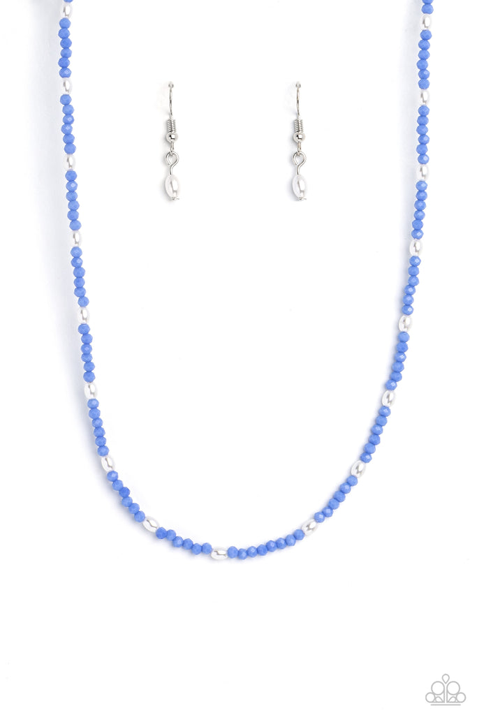 A dainty row of faceted blue crystal-like seed beads delicately links around the neck, resulting in a radiant glimmer. Dainty white, oval pearls infused along the neckline create additional refinement and charm to the design. Features an adjustable clasp closure.