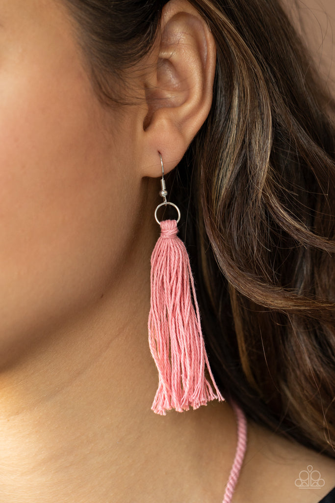 Rose Tan cording delicately wraps around a dainty wooden dowel, knotting into a tasseled macramé centerpiece at the bottom of a dramatically lengthened display. Features an adjustable sliding knot closure.