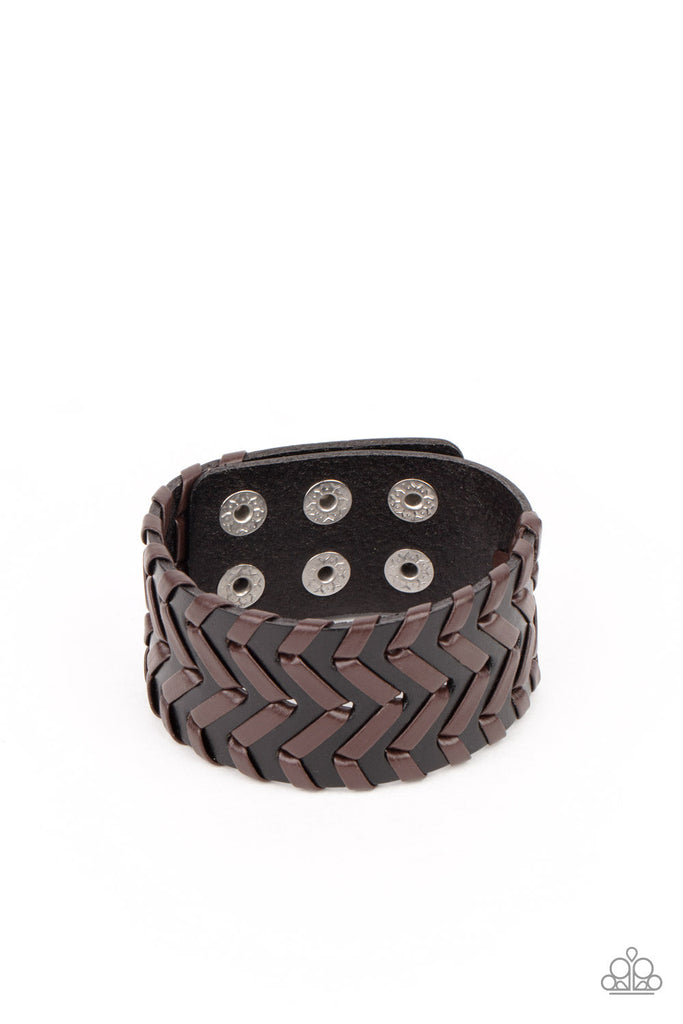 Brown leathery cording is laced across the front of a thick black leather band, creating an edgy chevron-like pattern. Features an adjustable snap closure.