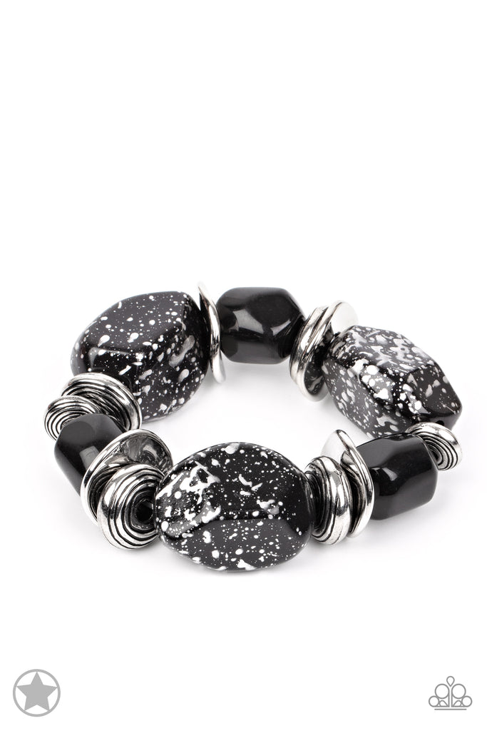 Chunky black beads with speckles of silver and a gorgeous glazed finish are threaded along a stretchy band with thick silver rings.