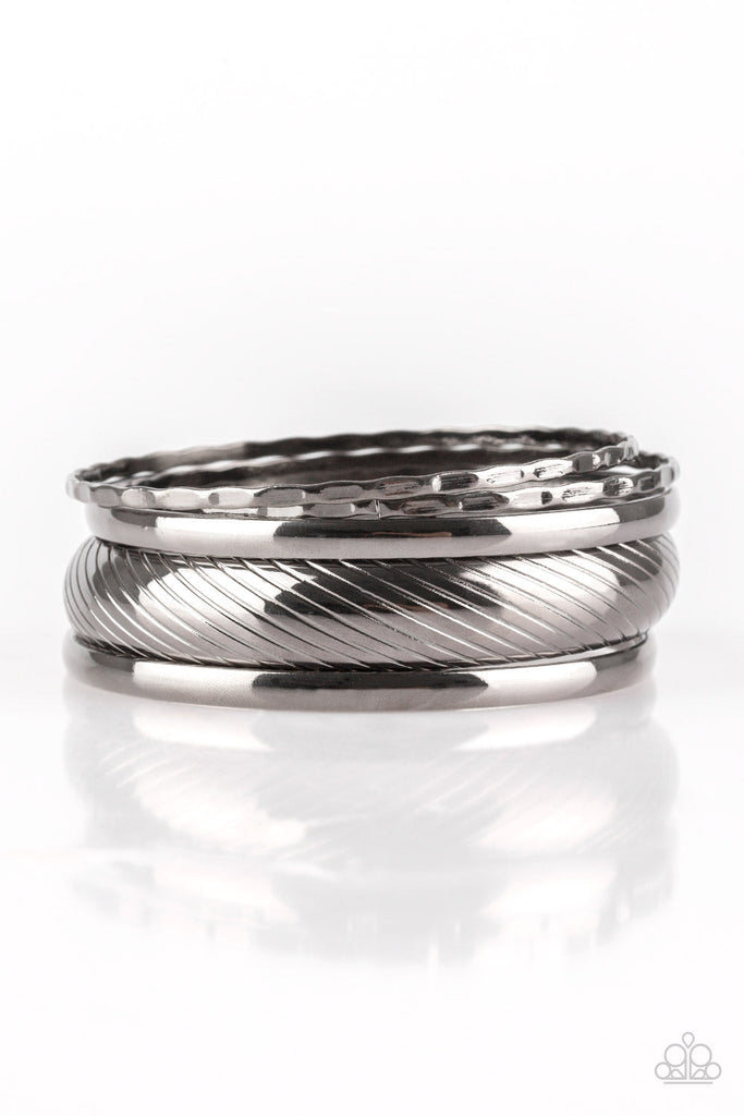 Featuring serrated and smooth surfaces, mismatched gunmetal bangles stack across the wrist for a casual look.