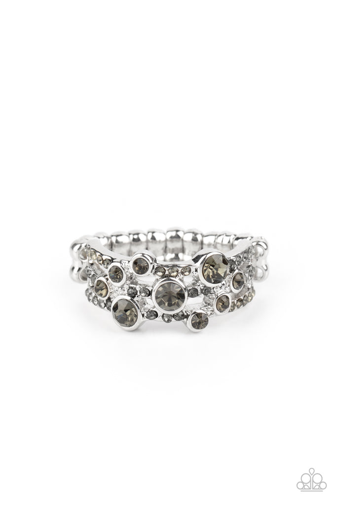 Bubbly smoky rhinestones dot shimmery silver bands encrusted in matching dainty smoky rhinestones, creating effervescent layers across the finger. Features a dainty stretchy band for a flexible fit.