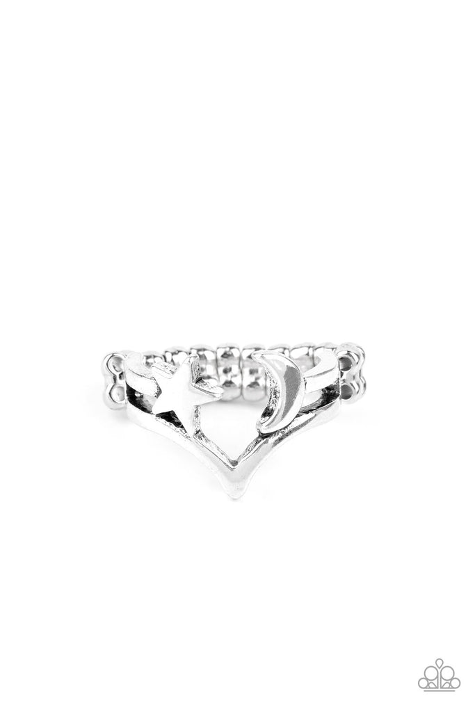 A dainty silver star and crescent moon join atop an arcing silver band across the finger, creating a stellar radiance. Features a dainty stretchy band for a flexible fit.