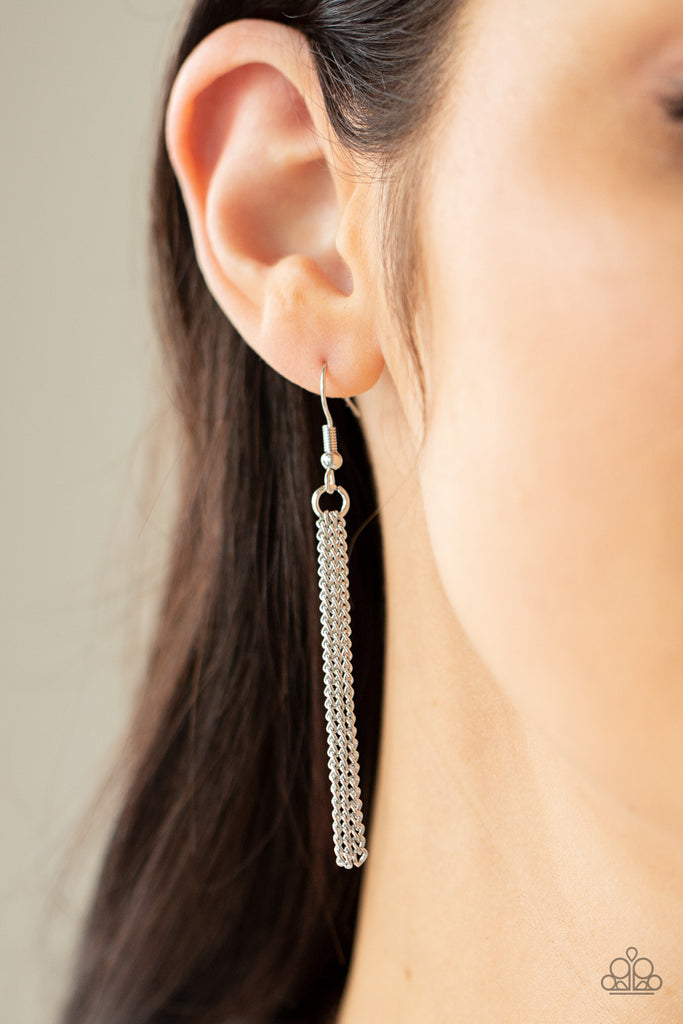 A hammered silver disc connects to a neon blue half moon acrylic frame at the bottom of a lengthened silver chain. A curtain of shimmery chains stream from the bottom of the stacked pendant, adding flirtatious movement to the colorful display. Features an adjustable clasp closure.