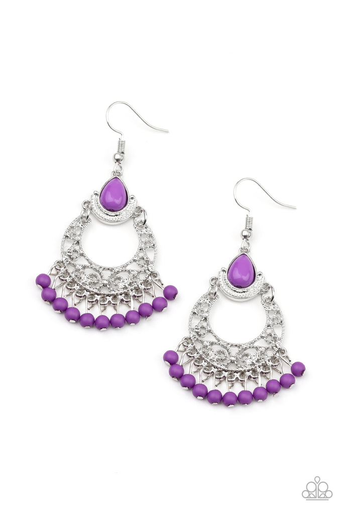 Infused with a purple beaded fringe, an ornate silver half moon frame swings from the bottom of a teardrop purple bead for a whimsical flair. Earring attaches to a standard fishhook fitting.