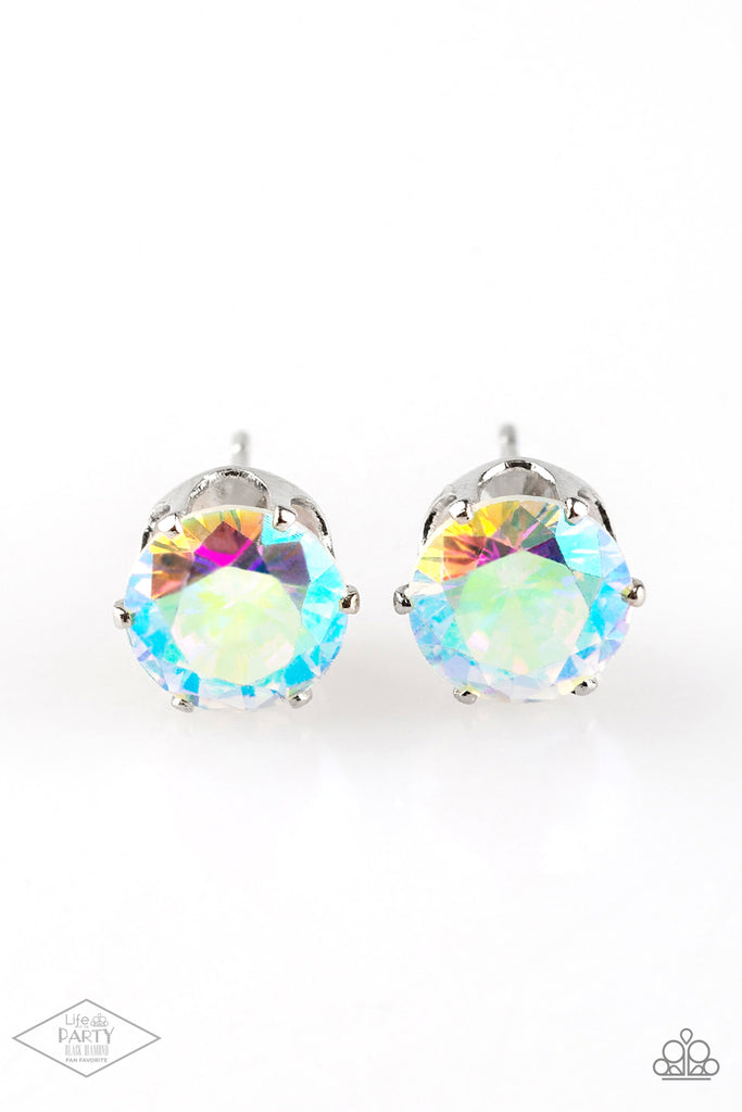 A glassy opalescent rhinestone is nestled inside of a shimmery silver frame for a timeless look. Earring attaches to a standard post fitting.