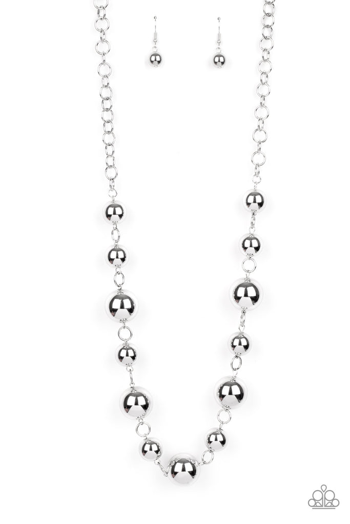 An oversized collection of intense silver beads boldly link below the collar, creating a dramatic industrial display. Features an adjustable clasp closure.