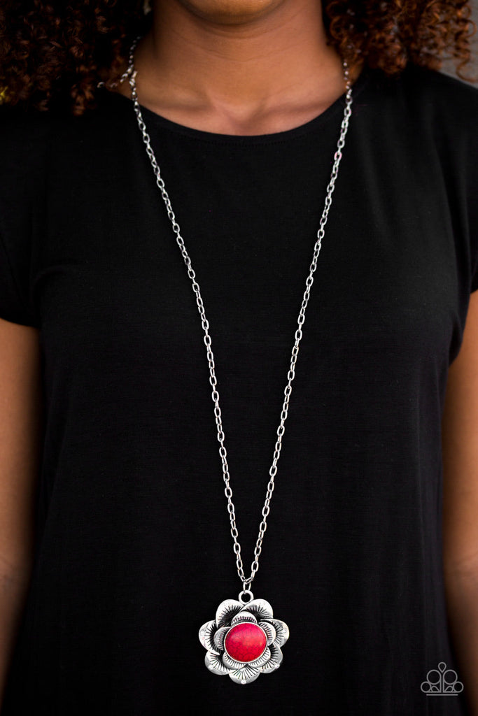 Etched in lifelike textures, shimmery silver petals bloom for a red stone center, creating a dramatic floral pendant. Sprinkled in glittery white rhinestones, the earthy flower swings from the bottom of a bold silver chain in a seasonal fashion. Features an adjustable clasp closure.