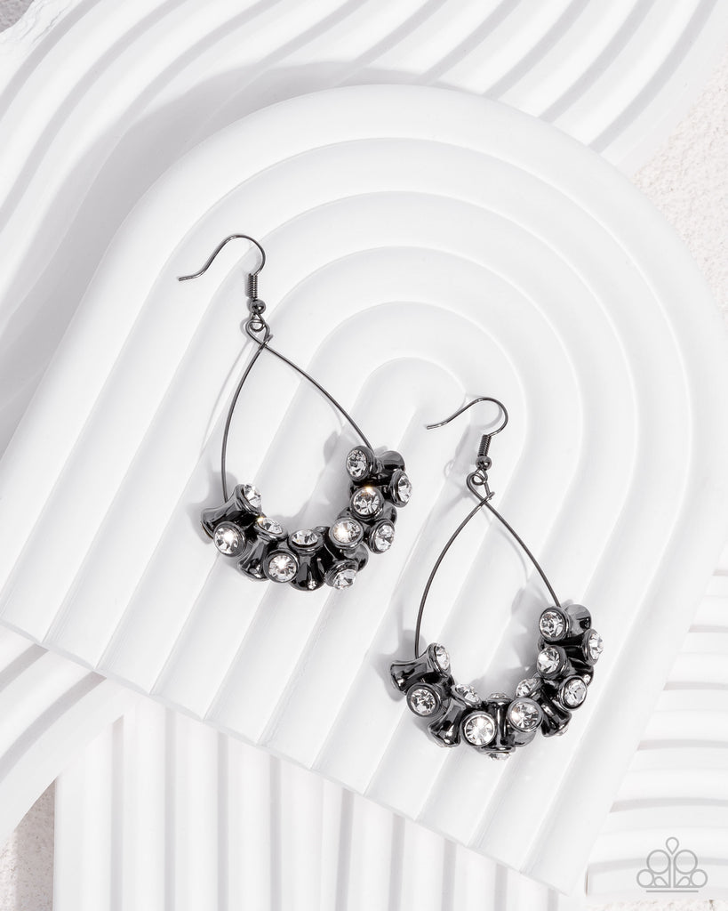 Hourglass-inspired gunmetal fittings, capped on both ends with faceted white rhinestones, are infused and twist along the bottom curve of a gunmetal teardrop wire hoop, resulting in an industrial bold fringe. Earring attaches to a standard fishhook fitting.