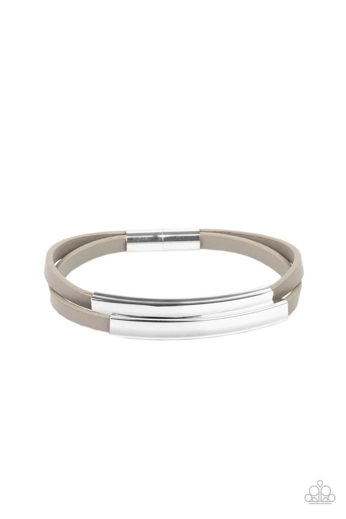 Curved silver rectangular frames glide along two dainty strands of gray leather, creating edgy layers around the wrist. Features a magnetic closure.