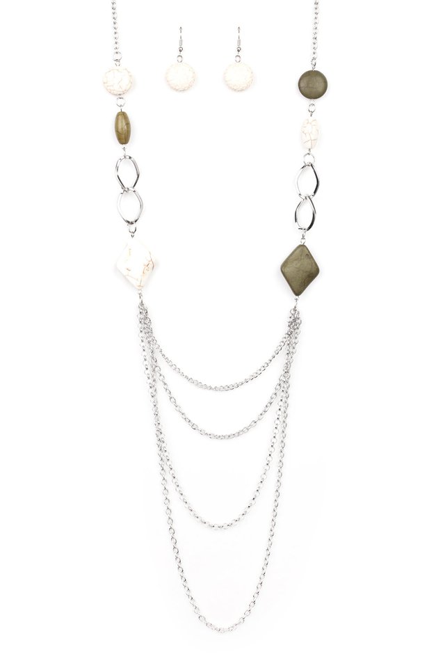 Mismatched green and white stone beads and angular silver hoops give way to layers of shimmery silver chains down the chest for a seasonal look. Features an adjustable clasp closure. Sold as one individual necklace. Includes one pair of matching earrings.