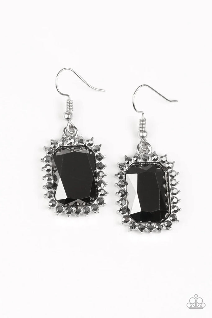 Featuring a regal emerald-style cut, a smoky hematite gem is pressed into a sleek silver frame radiating with dainty hematite rhinestones. Earring attaches to a standard fishhook fitting.