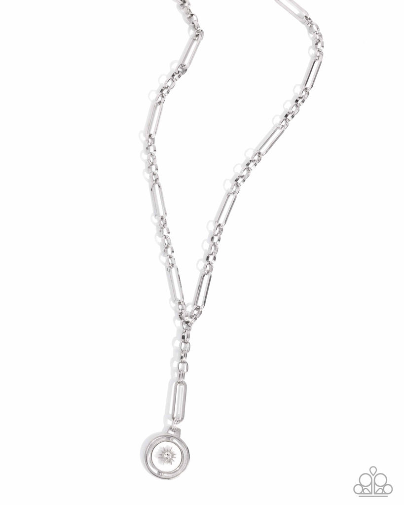Doubled collections of silver rings connect to elongated silver paperclip chain links as they extend below the collar in a y-shaped arrangement. Featuring a white rhinestone center, a three-dimensional dainty silver star rests atop a white shell pressed in a silver frame that effortlessly spins inside a larger silver circle frame, threaded along a dainty silver rod, extending from the center of the design for a cosmically coastal finish. Features an adjustable clasp closure.