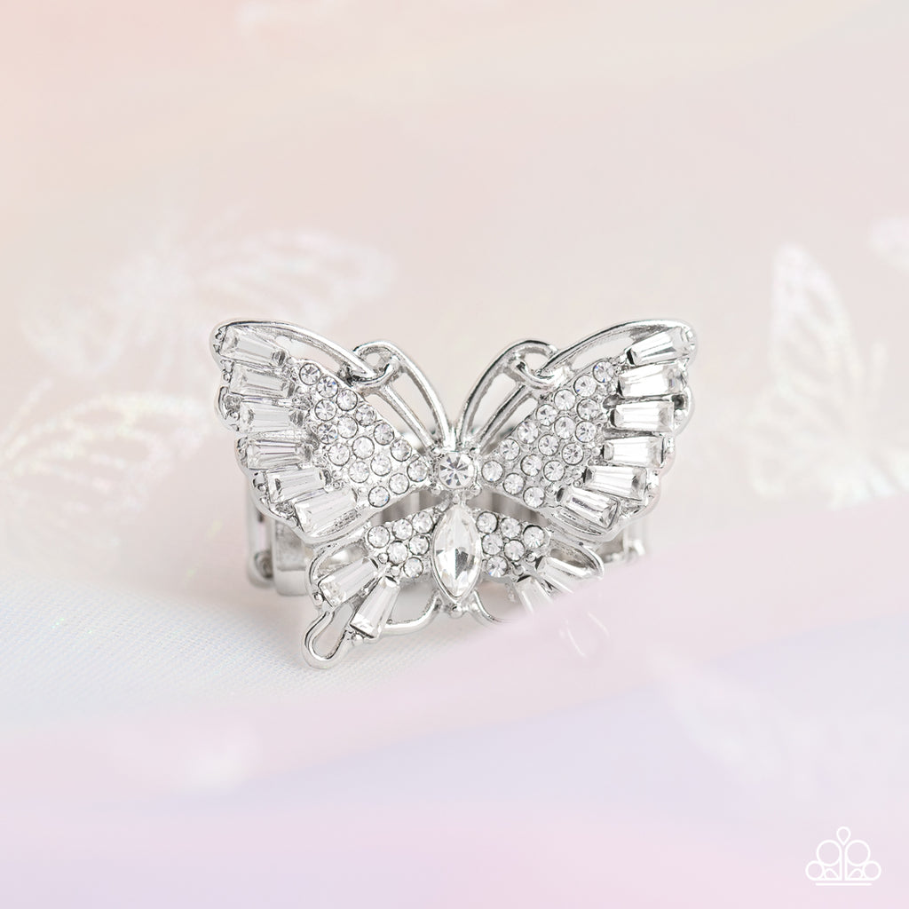 Sparkling with round, teardrop, and emerald cut white rhinestones, a silver butterfly fearlessly flutters atop the finger for a statement-making finish. Features a stretchy band for a flexible fit.