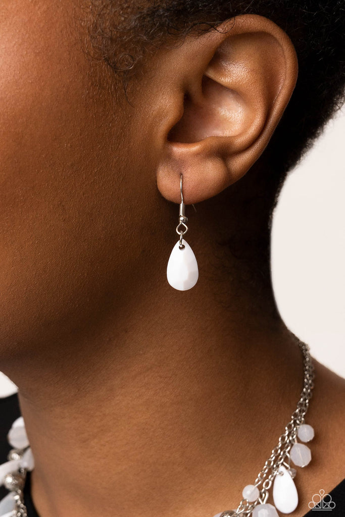 A dainty collection of white teardrop and round beads, textured silver accents, and faceted white crystal-like beads trickle from a single strand of silver chain, resulting in a cheekily clustered chandelier. Earring attaches to a standard fishhook fitting.