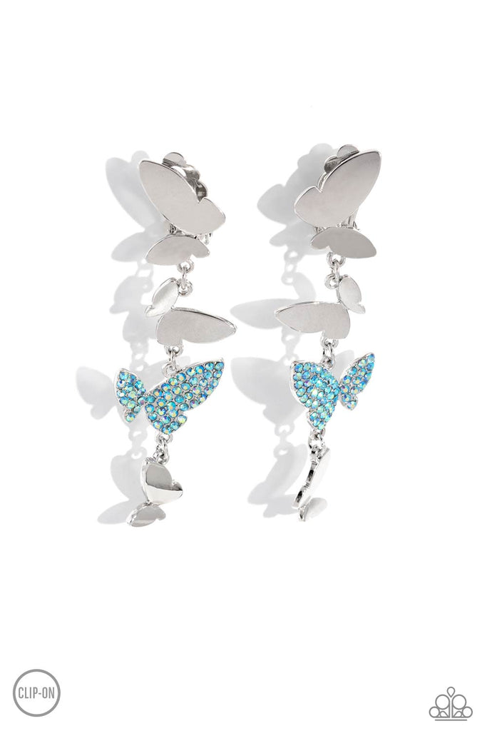 Three butterflies with high-sheen silver wings and one blue iridescent-encrusted butterfly flutter down the ear, creating a free-spirited lure. Each butterfly swings in whimsical asymmetry, creating the look of butterflies flying in alternating directions. Earring attaches to a standard clip-on fitting. Due to its prismatic palette, color may vary.
