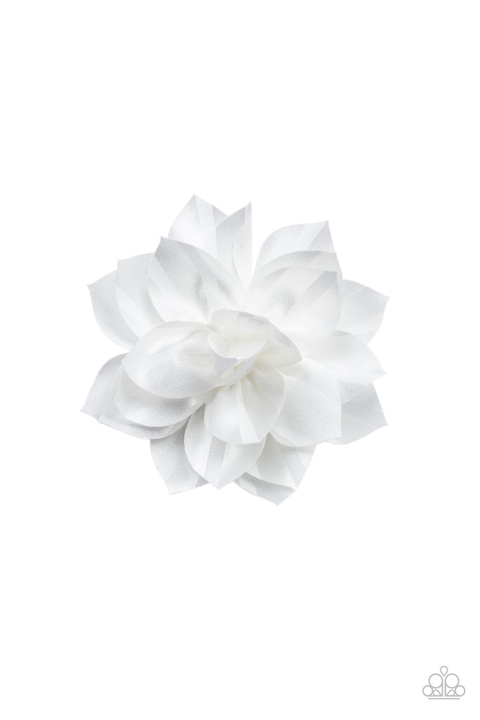 White ribbon-like petals gather into a satin blossom, creating an elegant display. Features a standard hair clip on the back.