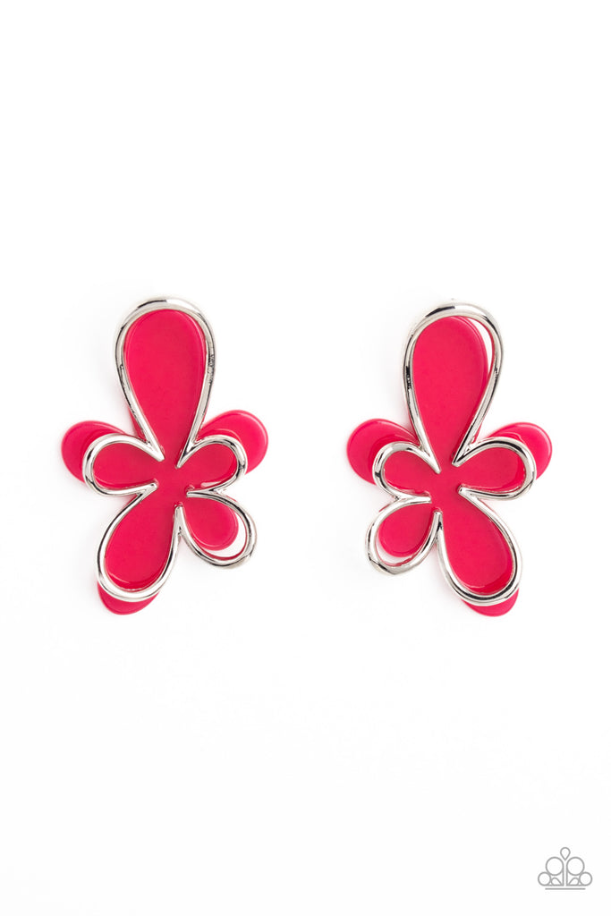 Overlapping a hot pink abstract acrylic flower, a silver outline in the same abstract floral shape glimmers atop the pop of color for a three-dimensional fashionable lure. Earring attaches to a standard post fitting.