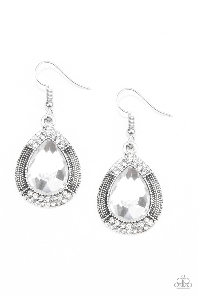 A faceted white teardrop gem is pressed into a shimmery silver frame radiating with studded details and glittery white rhinestones for a magnificent look. Earring attaches to a standard fishhook fitting.