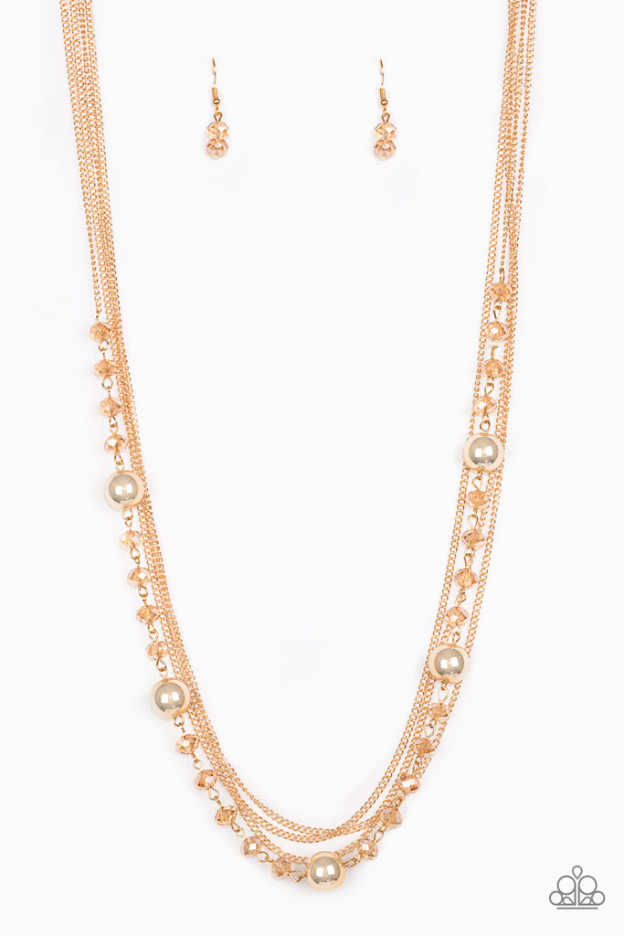Infused with rows of shimmery gold chains, a strand of golden crystal-like beads and classic gold accents drape across the chest for a regal finish. Features an adjustable clasp closure.