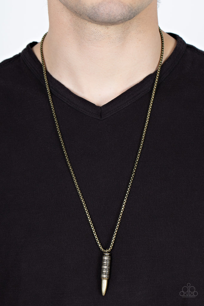 A tribal-inspired motif wraps around a brass bullet-shaped pendant at the end of a round brass box chain resulting in a striking ancestral adornment below the collar. Features an adjustable clasp closure.