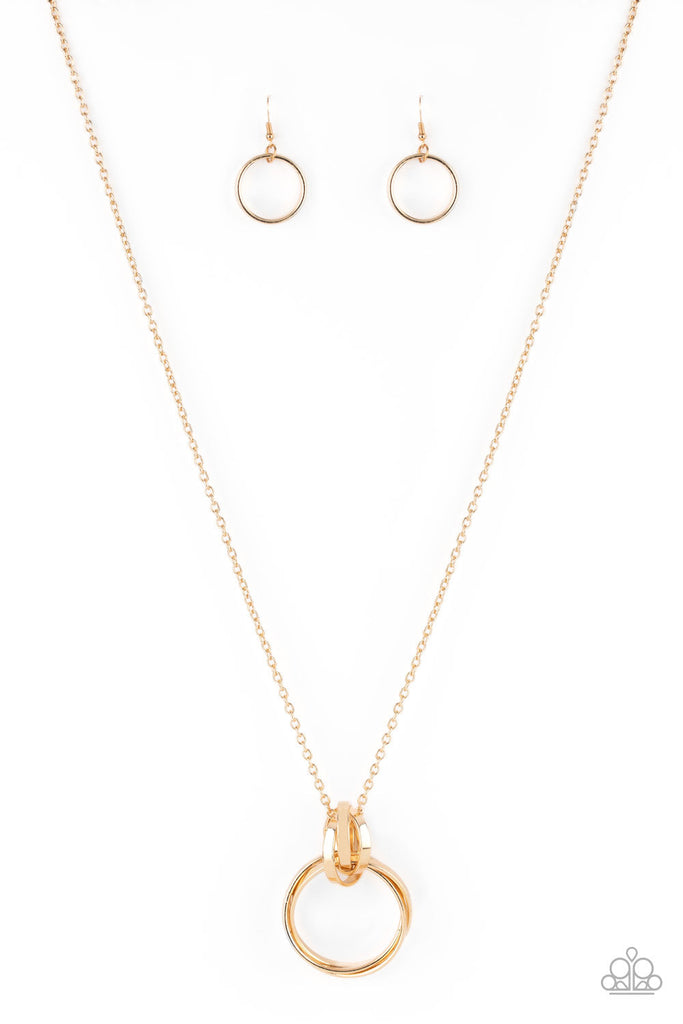 Trios of exaggerated gold rings link at the bottom of a lengthened gold chain, creating a dramatic industrial pendant. Features an adjustable clasp closure.
