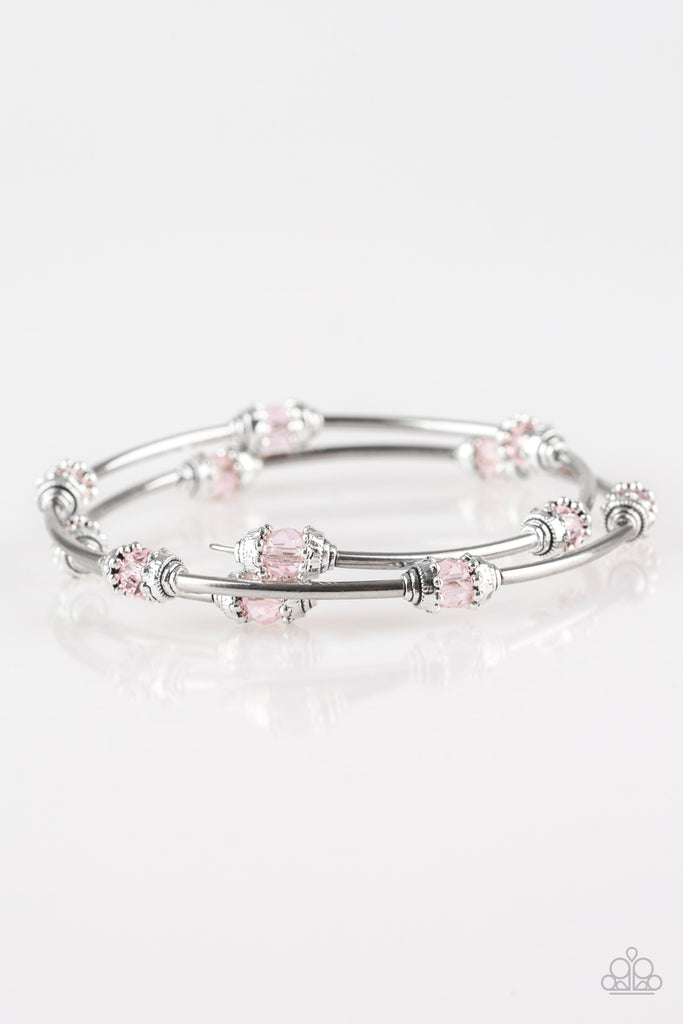 Dainty pink crystal-like beads and shimmery silver accents alternate along a coiled wire to create a refined infinity wrap style bracelet.