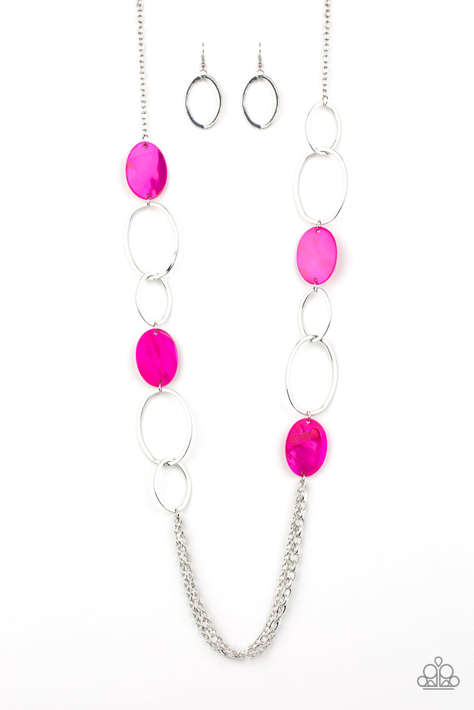 Brushed in a shell-like iridescence, a collection of flat pink beads and mismatched silver hoops give way to layers of silver chains down the chest for a whimsical look. Features an adjustable clasp closure.