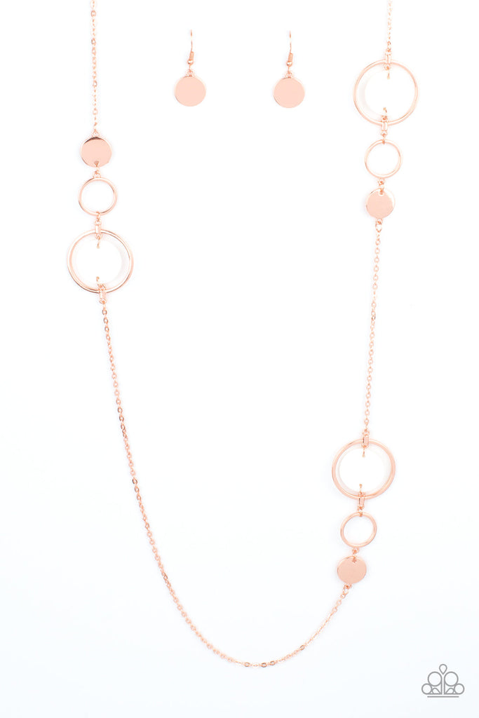 A shimmery collection of dainty shiny copper discs, shiny copper rings, and white shell-like frames delicately link across the chest, creating a summery display. Features an adjustable clasp closure.