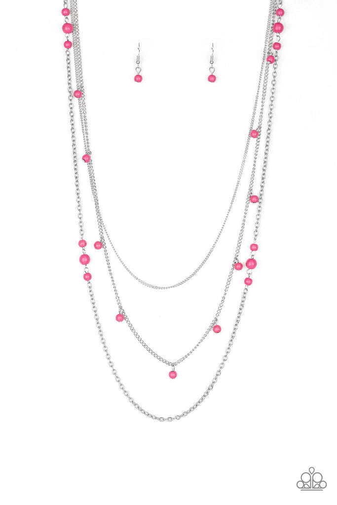 Infused with a plain silver chain, mismatched pink stone beads sporadically trickle along shimmery silver chains, creating vivacious layers down the chest. Features an adjustable clasp closure.