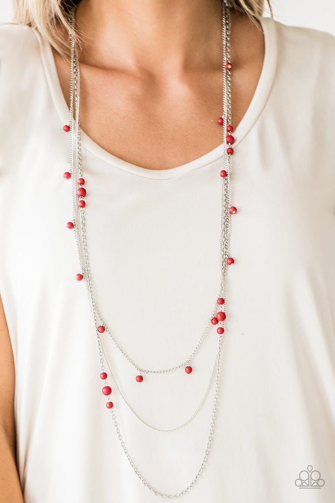 Infused with a plain silver chain, mismatched fiery red stone beads sporadically trickle along shimmery silver chains, creating vivacious layers down the chest. Features an adjustable clasp closure.