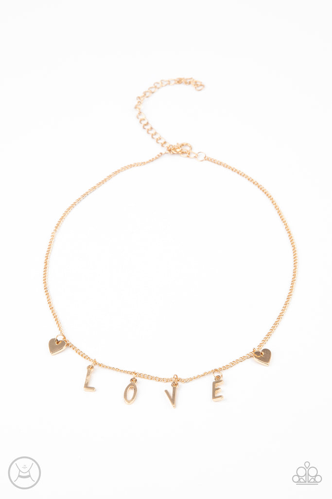 Nestled between a pair of dainty gold hearts, dangling gold letter charms spell out the word, "LOVE," creating a flirty fringe around the neck. Features an adjustable clasp closure.