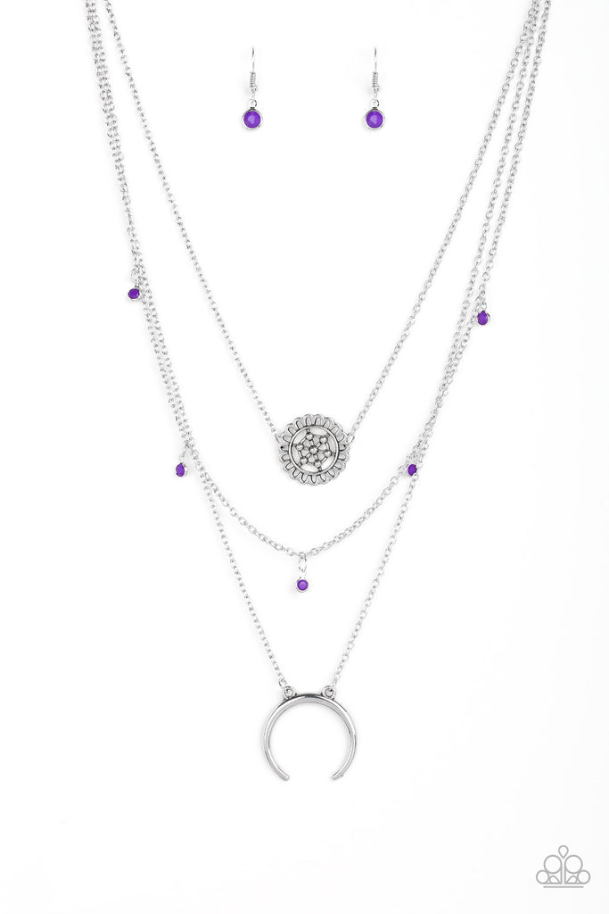 A silver floral frame swings from the uppermost chain, above a strand of faceted purple beads swinging from a shimmery silver chain. A silver crescent frame swings from the lowermost chain, creating whimsical layers down the chest. Features an adjustable clasp closure.