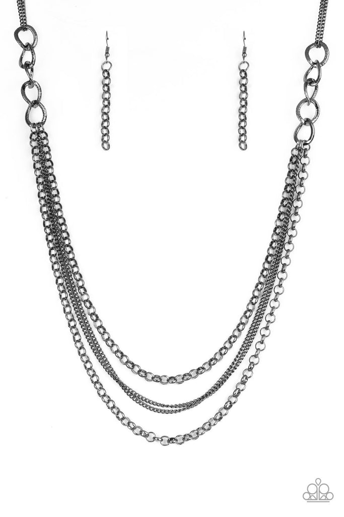 Bold gunmetal chain links give way to layers of mismatched gunmetal chain, creating a dramatic industrial collision. Features an adjustable clasp closure.