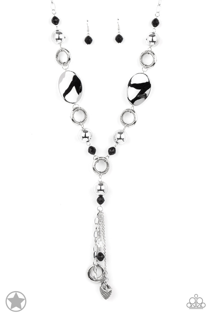 Long chain of black crystalized beads, curved plates of silver with a pearly finish, and chunky silver rings lead down to a tassel of chains and charms, including a crescent moon and a heart.