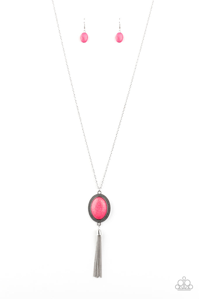 A vivacious pink stone is pressed into the center of an oval silver frame dotted in studded textures. Infused with a whimsical silver tassel, the earthy pendant swings from the bottom of a lengthened silver chain for a seasonal look. Features an adjustable clasp closure.