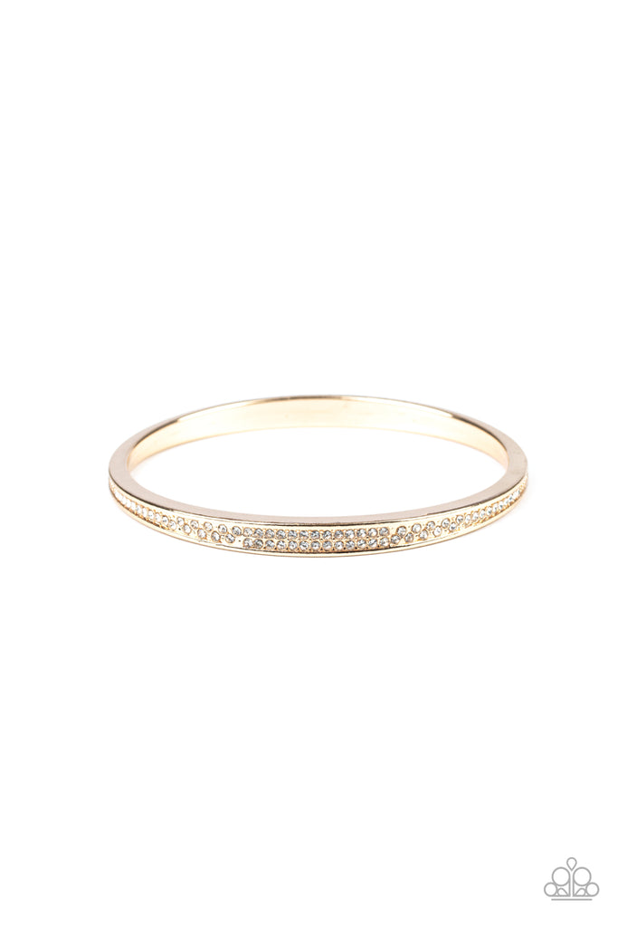 Rows of dainty white rhinestones have been encrusted along the front of a thick asymmetrical gold bangle for a timeless twist.