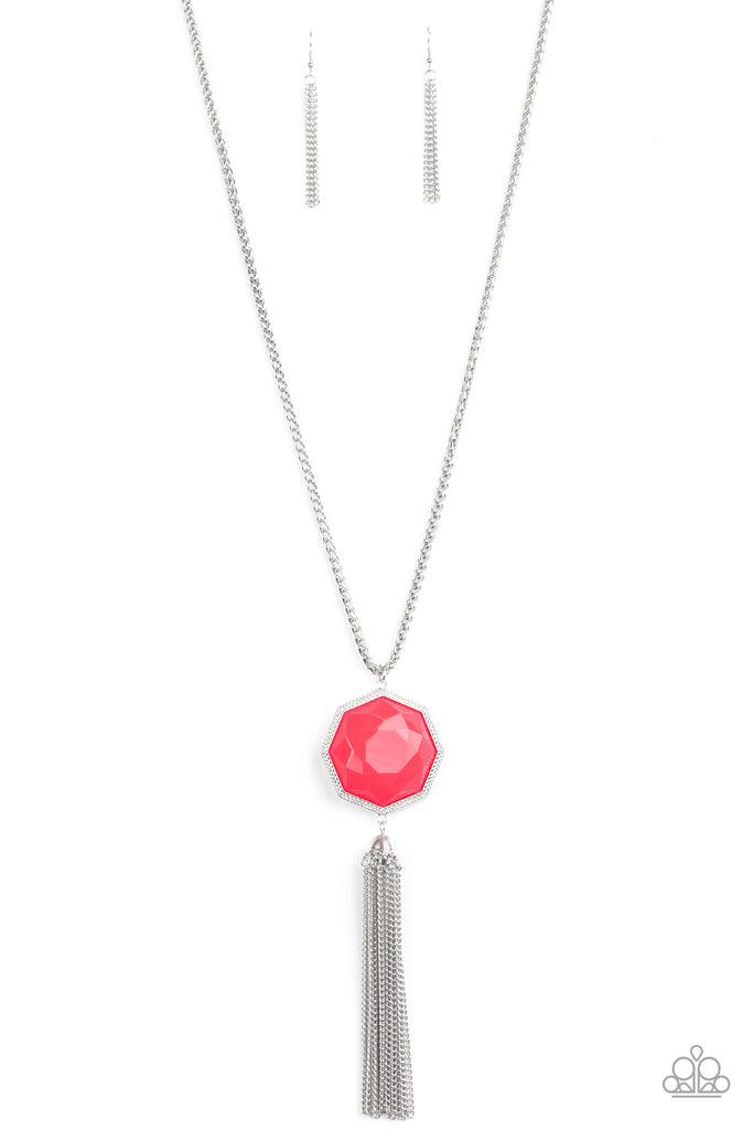 Featuring a faceted surface, a neon pink bead is pressed into the center of a decorative silver polygon frame at the bottom of an ornate silver chain. Capped in a silver bead, shimmery silver chains stream from the bottom of the pendant, creating a playful tassel. Features an adjustable clasp closure.