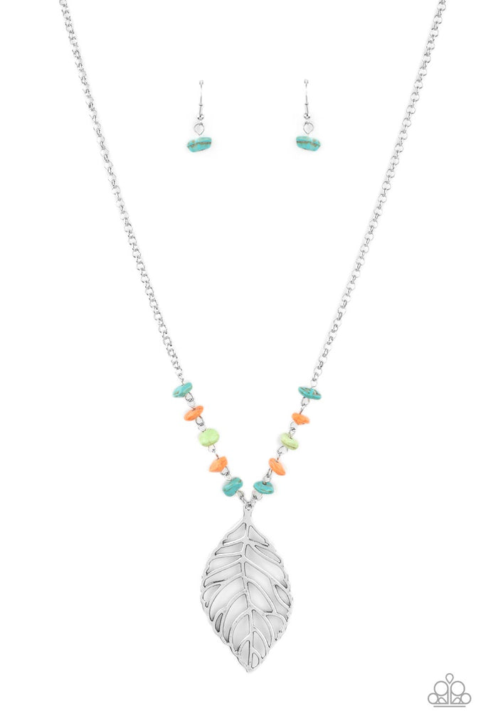 An airy lifelike silver leaf swings from the bottom of a multicolored stone dotted chain, creating a colorful seasonal pendant. Features an adjustable clasp closure.
