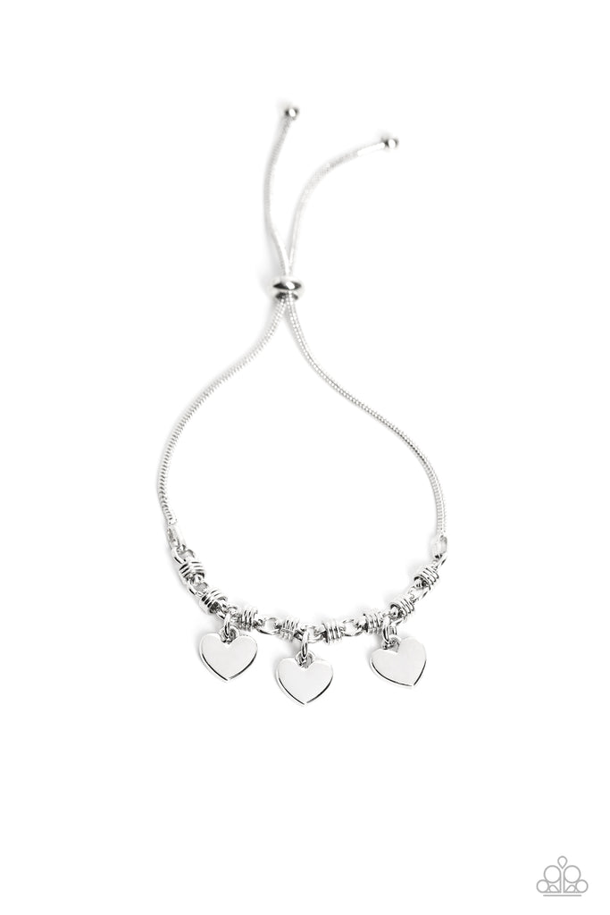 Dangling from a silver snake chain, a trio of silver hearts link across the wrist for a dash of swoon-worthy sheen. Infused along the heart chain, silver spiral-like accents add additional texture to the monochromatic design. Features an adjustable sliding knot closure.