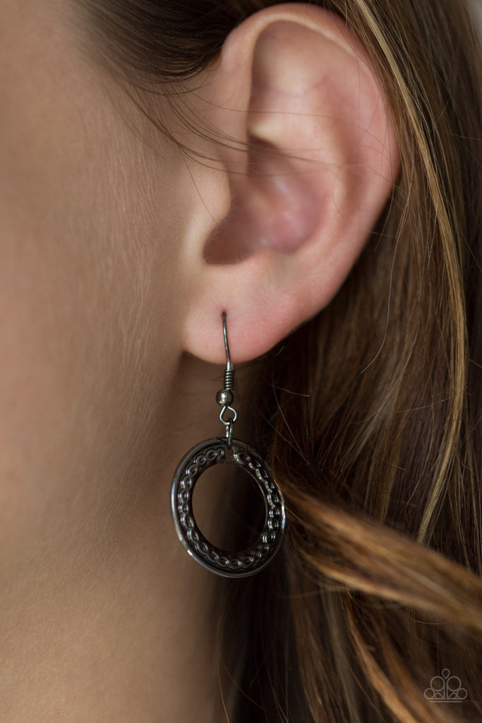 Embossed in swirling tribal detail, brass, copper, and gunmetal frames swing from the bottom of an elongated gunmetal chain, creating an airy stacked pendant. Features an adjustable clasp closure.