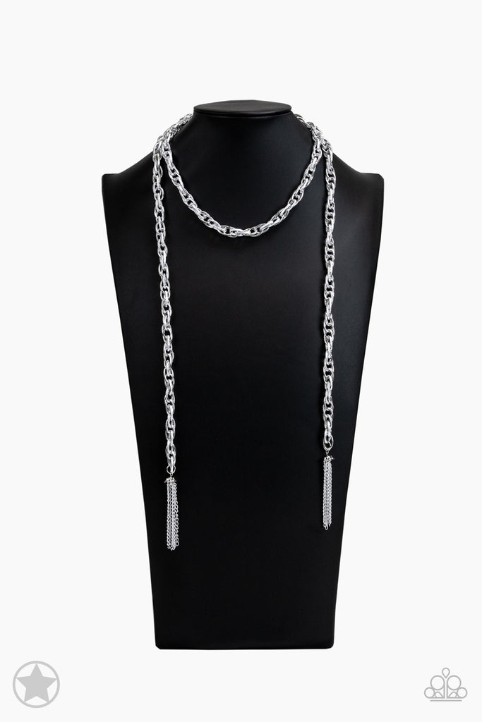 A single strand of spiraling, interlocking links with light-catching texture is anchored by two tassels of chain that add dramatic length to the piece. Undeniably the most versatile piece in Paparazzi's history, the scarf necklace features FIVE different ways to accessorize: Open Layer, Loop, Traditional Wrap, Double Knot, and Nautical Knot.
