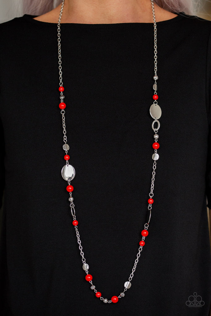 An array of polished red beads, silver discs, and ornate silver accents trickles along a shimmery silver chain for a whimsical look. Features an adjustable clasp closure.