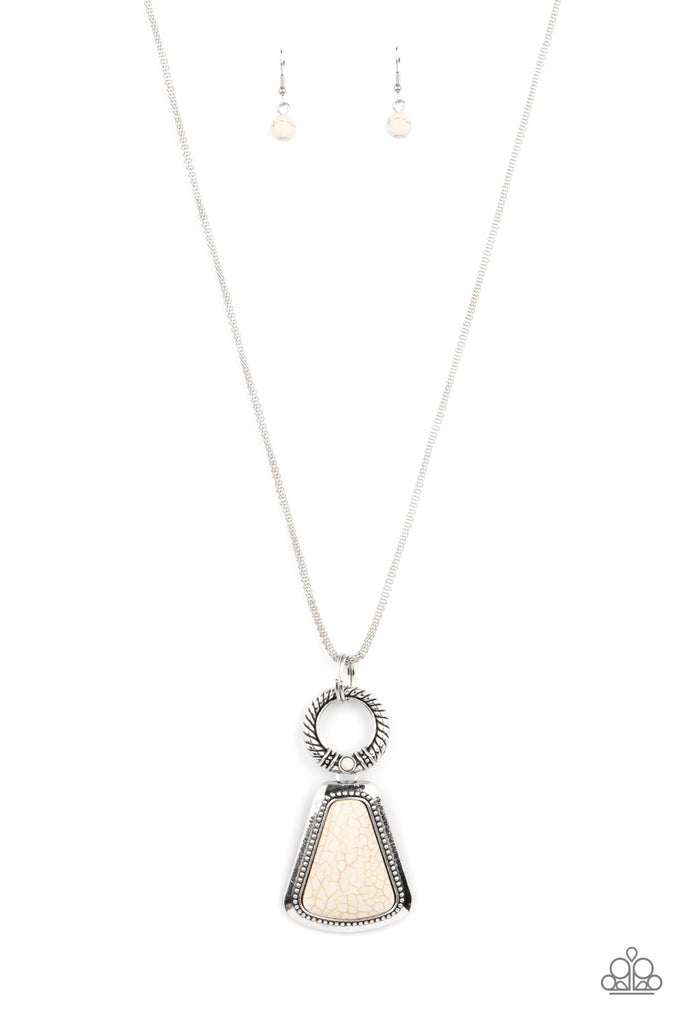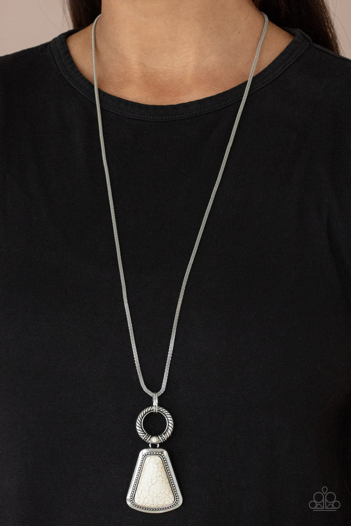 A flared triangular white stone is pressed into the center of a studded silver frame that attaches to a textured ring that is dotted with a dainty white stone, creating a dramatically earthy pendant at the bottom of a lengthened rounded mesh chain. Features an adjustable clasp closure.