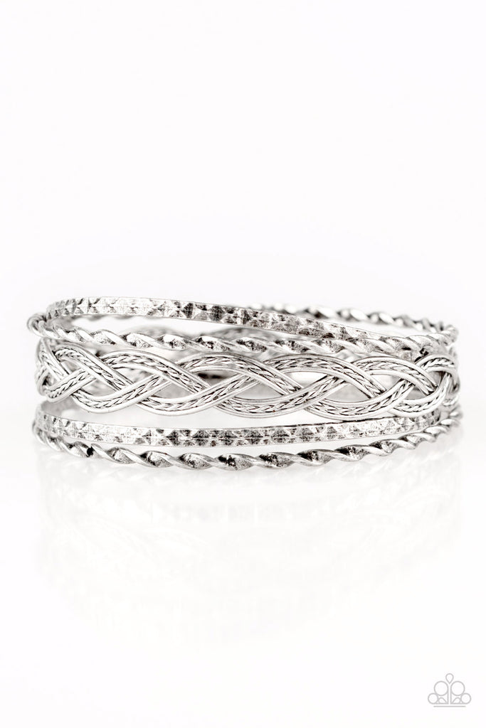 Featuring smooth and textured finishes, mismatched silver bangles glide along the wrist for a causal fashion.