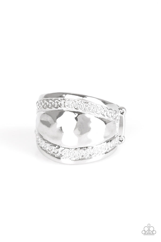 Ribbons of circular texture are embossed along the borders of a hammered silver band for an edgy look. Features a stretchy band for a flexible fit.