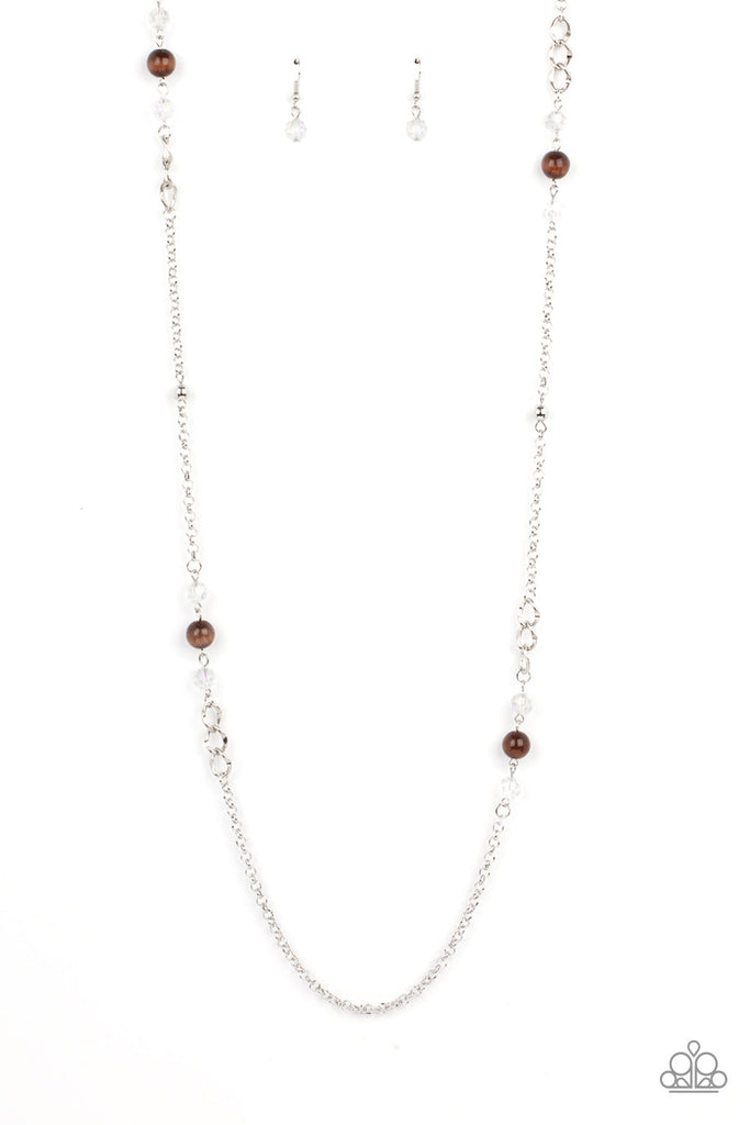 Infused with dainty silver beads, rows of iridescent crystal-like accents and glowing brown cat's eye stone beads adorn sections of mismatched silver chain across the chest for a trendy pop of color. Features an adjustable clasp closure.