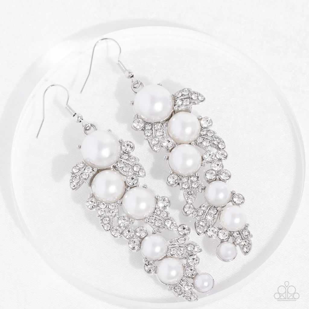 An explosion of glittery white rhinestones and oversized pearls coalesce into an exaggerated leafy silver lure, creating a dramatic statement piece. Earring attaches to a standard fishhook fitting.