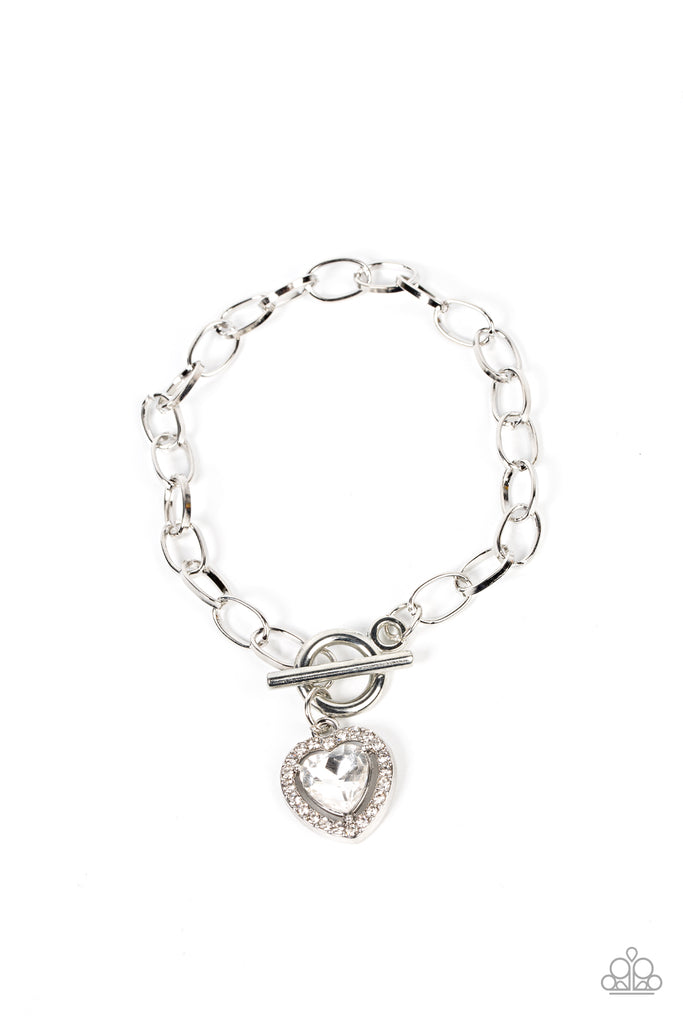 Bordered in glassy white rhinestones, a white heart shaped gem sparkles from a toggle closure at the center of an oval silver linked chain for a flirtatious fashion around the wrist. Features a toggle closure.